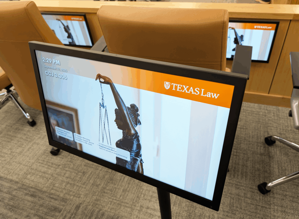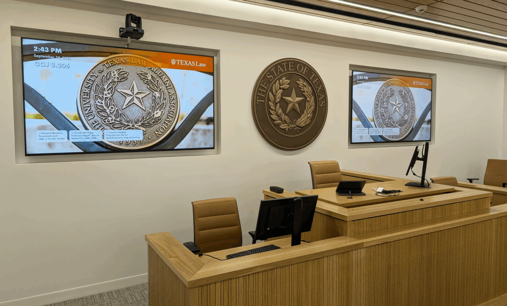 After previous successful collaborations, UT Law again chose to partner with the LAITS Technology Integration team. The challenge: incorporate modern AV systems into a dignified courtroom setting without compromising the aesthetic or legal integrity of the space.